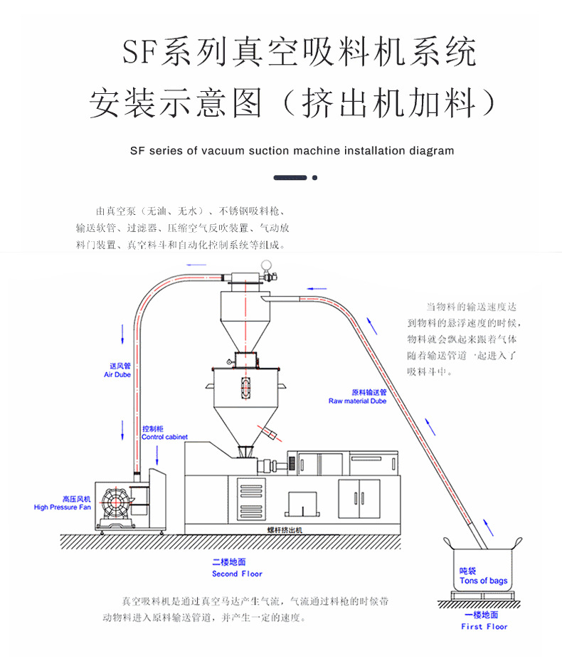 真空上料機又叫真空吸料機、真空輸送機、負壓上料機、真空加料機、主要針對工廠原料的輸送時,粉塵大、用人成本高、工人搬運累、環保不達標等一系列問題。
